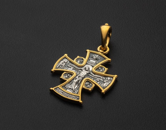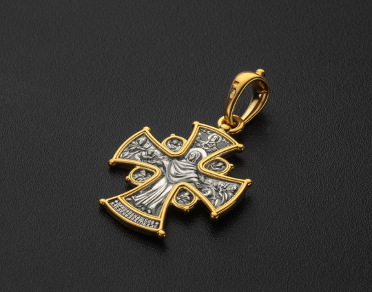 Крест Распятие Христово. Икона Божией Матери "Всех скорбящих Радость" | 101_528pz | Серебро 925 пробы с позолотой