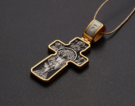 На нательной стороне - изображение Архангела Михаила Его почитают как защитника воинов, заступника тех, кто ищет правду, и тех, кто борется со злом.  По бокам от Святого Михаила изображения еще двух святых: Иоганна Златоуста и Василия Великого. Над ними – икона с образом Божией Матери «Знамение». Прославление она получила в 19 веке на Новгородской земле. До сих пор чтят ее верующие, просят у нее защиты и заступничества перед Богом.