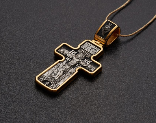 На передней стороне этого серебряного креста - Распятие Христово. Над ним написаны божественные слова.