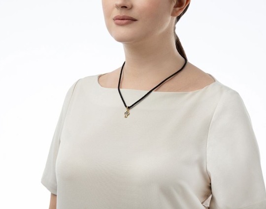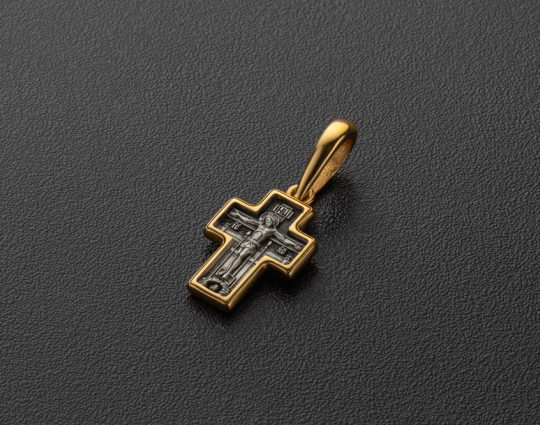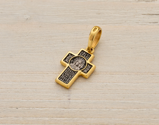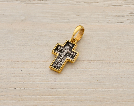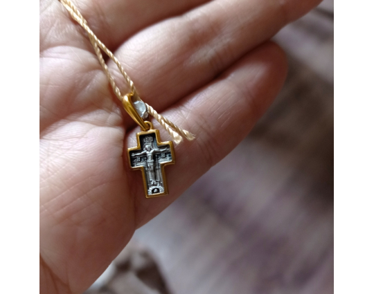 На лицевой стороне крестика из серебра 925 пробы с позолотой изображено Распятие. На обороте - Казанская икона Богородицы. Это один из самых почитаемых образов. Молитва ему способна помочь в печали или унынии, при заболеваниях, как физических, так и духовных. Её ставили возле детских кроваток, что бы оградить детей от болезней, зла, сглазов и прочего.
