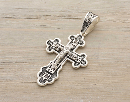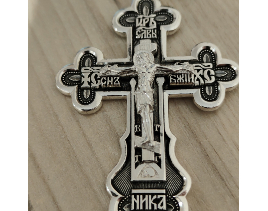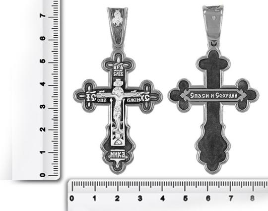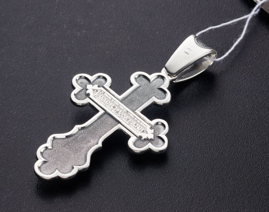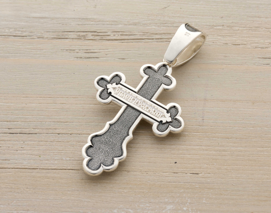 На передней части креста изображено Распятие Иисуса Христа. Над ним расположена надпись «Царь Славы». Выше нарисован шестикрылый серафим. Считается, что они ближе всех находятся к Богу. У ног Иисуса написано «Ника». Это означает победу Христа над смертью.
