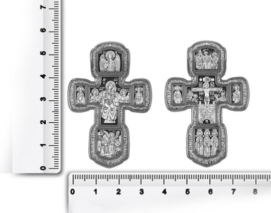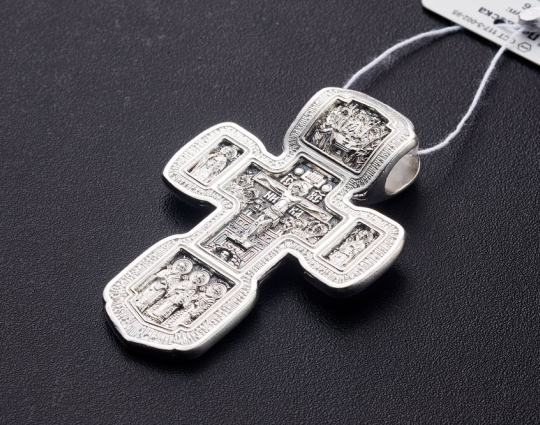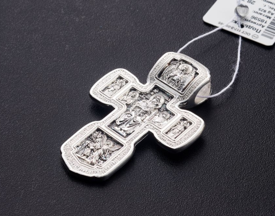 Серебряный крест с изображением в центральной части Распятия Христова и тех Святых, которые были рядом с Ним в тот момент.  Возле Распятого Иисуса-самые значимые для верующих иконы: Святая Троица, Три Спасителя Вселенских. По бокам, на горизонтальной планке - иконы Святого Николая и Мученика Трифона. По контуру ювелирное изделие огибают слова-обращения к Богу.