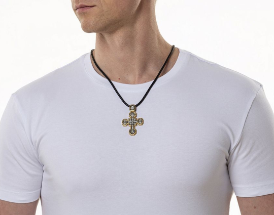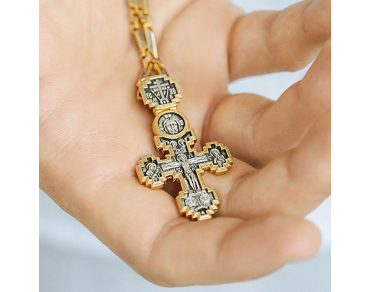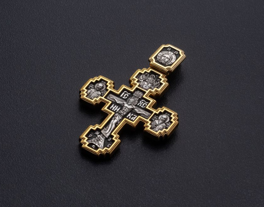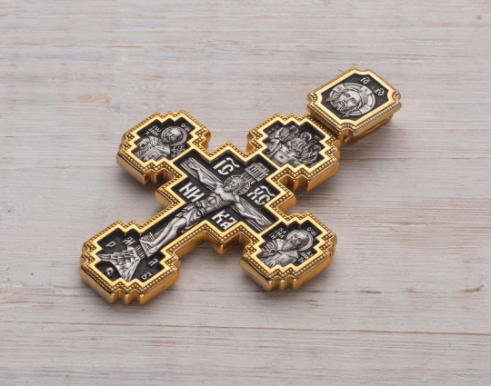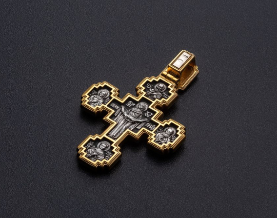 Над Распятием Иисуса Христа на этом нательном крестике из серебра помещена икона Пресвятой Троицы, образ Триединого Бога, явившегося в виде трех Ангелов Аврааму. Они сидят за трапезным столом вокруг чаши, символизирущей грядущую жертву Иисуса Христа.