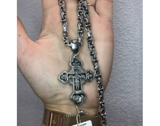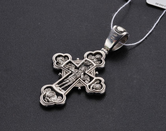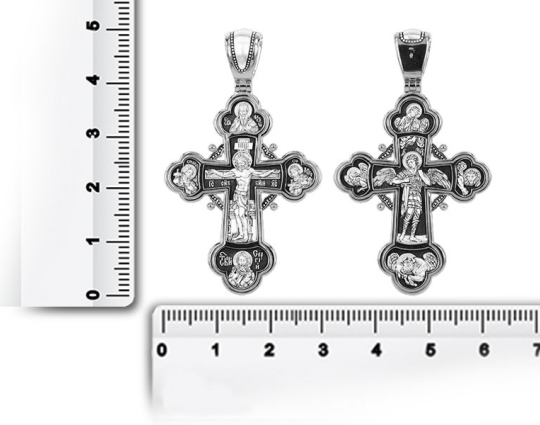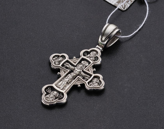 Изящный серебряный крест с изображением на лицевой части Распятия Иисуса Христа. Вокруг него Великие русские князья: Александр Невский и Димитрий Донской. Им поклоняются как покровителям воинов в их нелегких делах. Над Распятием изображен святитель Алексий. Он- признанный помощник в семейных делах, связанных с детьми. Иногда к нему обращаются за исцелением глазных болезней. В нижней части креста – образ Сергия Радонежского. У него также просят семейного благополучия и исцеления от болезней.