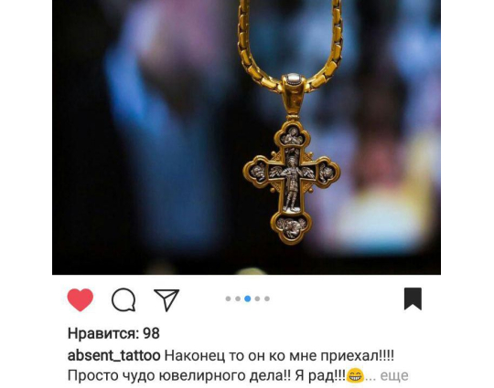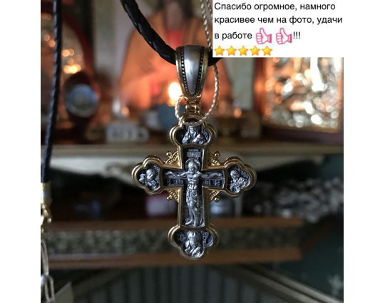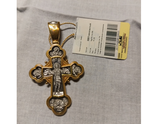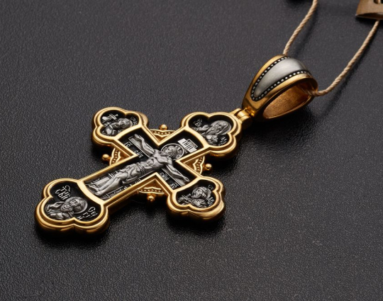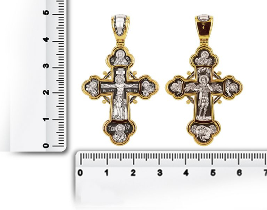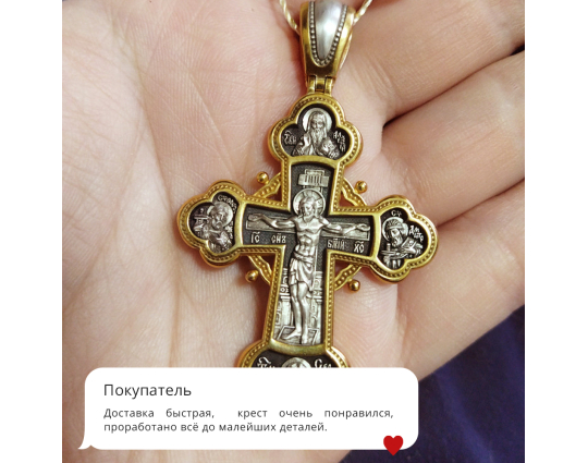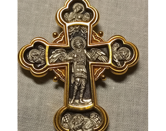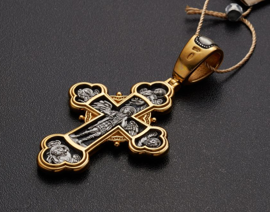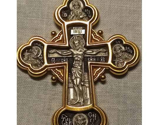 Крест из серебра с позолоченной отделкой и изображением Распятия Христа на лицевой стороне. По бокам от него изображены Великие русские князья, которые считаются защитниками верующих, покровителями воинов. Это иконы Александра Невского и Дмитрия Донского. В верхней части креста - икона митрополита московского Алексия. Ему молятся о детях, просят исцеления от болезней, особенно от глазных. Внизу - образ Сергия Радонежского. Его также просят о детях, о помощи в непростых жизненных ситуациях и об исцелении.