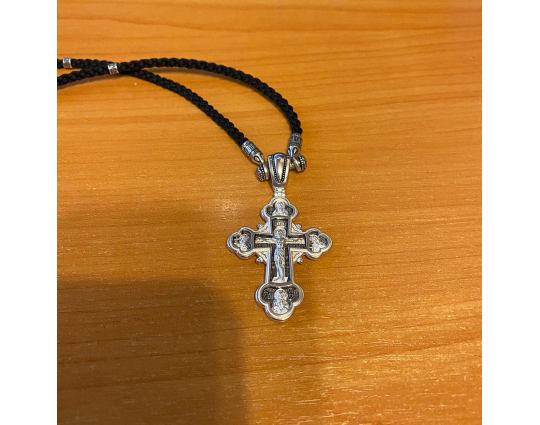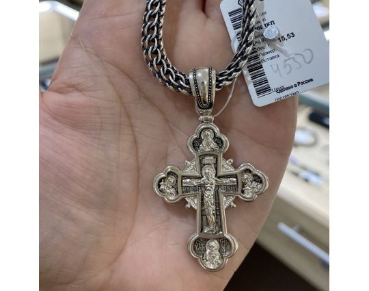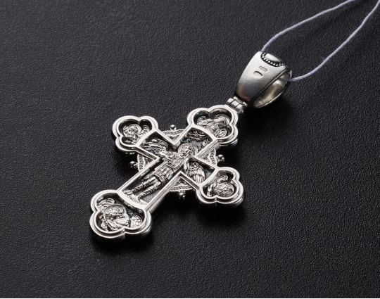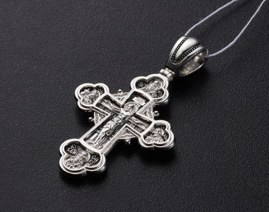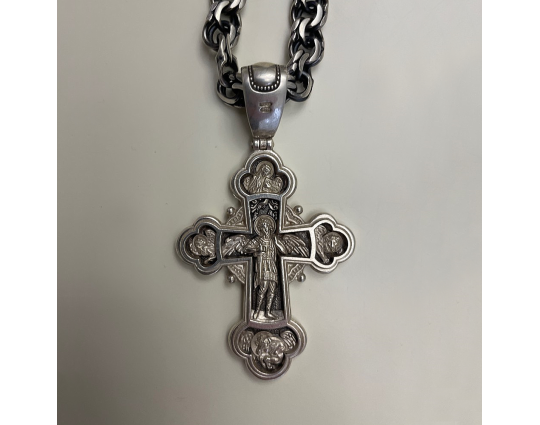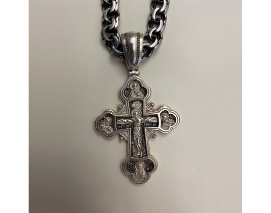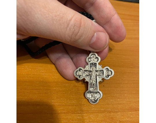 Крест из серебра с Распятием Христа на передней части. По бокам от него изображены Великие русские князья, которые считаются защитниками верующих, покровителями воинов. Это иконы Александра Невского и Дмитрия Донского. В верхней части креста - икона митрополита московского Алексия. Ему молятся о детях, просят исцеления от болезней, особенно от глазных. Внизу - образ Сергия Радонежского. Его также просят о детях, о помощи в непростых жизненных ситуациях и об исцелении.