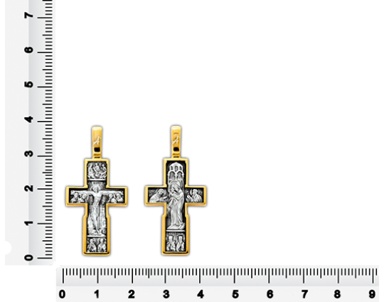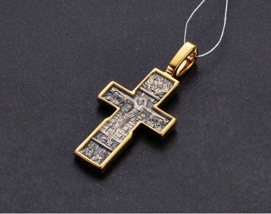 Необычный по форме крест с позолоченной отделкой, на лицевой стороне которого, традиционно нарисовано Распятие Иисуса. Ему предстоят в молитве Иоанн Богослов и Лонгин Сотник, Мария Магдалина и Святая Богородица.