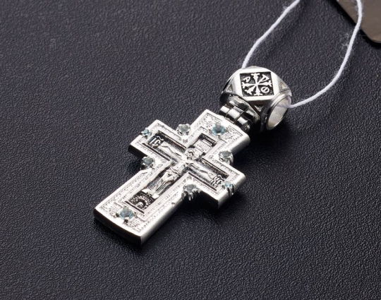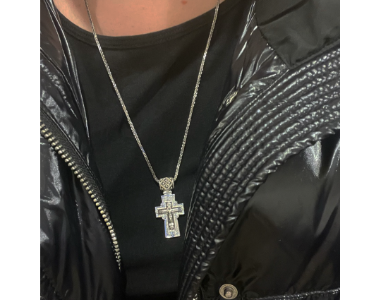 Серебряный крест с изображением Распятия Иисуса Христа. Над Распятием закреплена бусина с Хризмой, которая является древнейшим символом Христа. Она составлена из греческих букв, с которых начинается его имя.