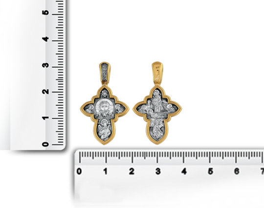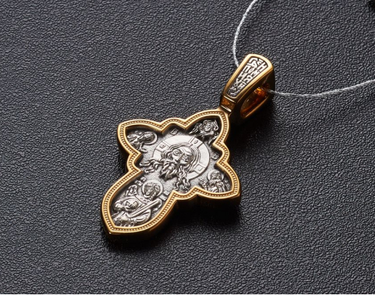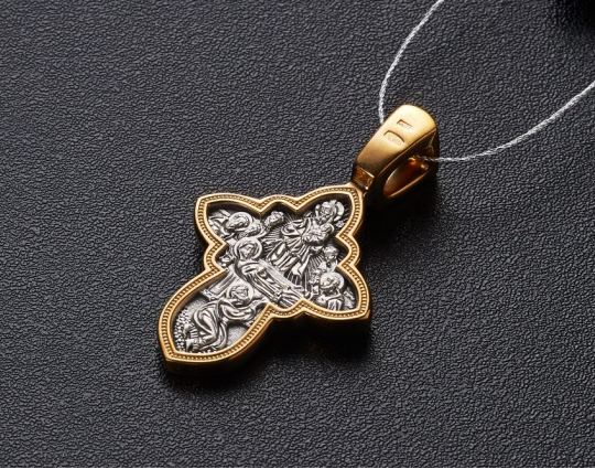 Небольшой, изящный крестик из серебра с позолоченной отделкой, который посвящен большому церковному празднику «Успения Богоматери». Считается, что Богоматерь не умерла, а просто уснула, чтобы передать свою Душу в руки Бога и Сына. Часто ее изображают лежащую на ложе, вокруг которого собрались апостолы. Икона этого праздника занимает всю нательную сторону креста.