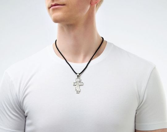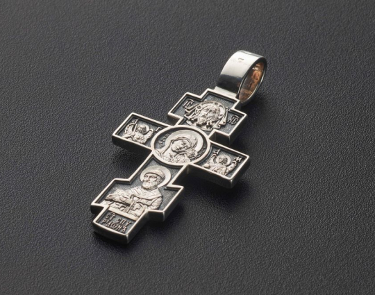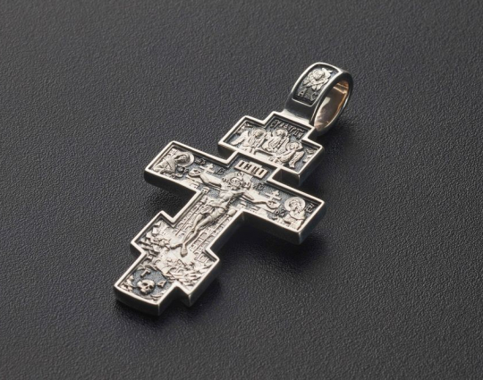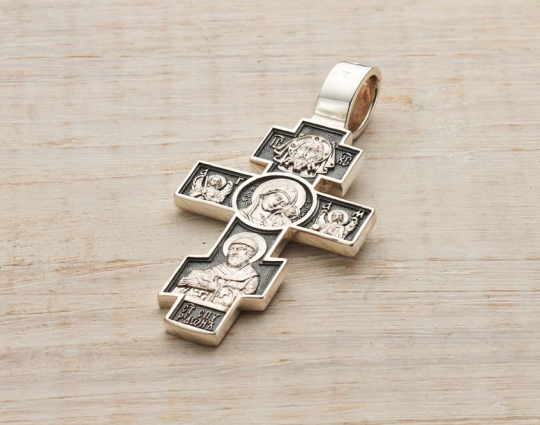 На лицевой стороне крестика из серебра 925 пробы изображено Распятие с предстоящими Девой Марией и Иоанном Предтечей. По традиции они изображены слегка согнутыми в молитве за людские души.