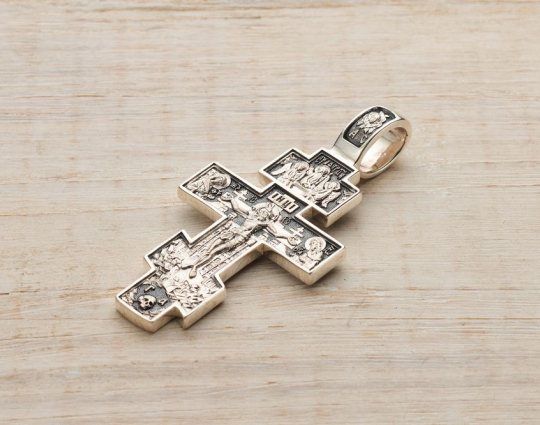 Над Распятием изображена Пресвятая Троица - важнейший символ Православия, а на ушке - Шестикрылый Серафим. Это ангел, наиболее приближенный к Богу, оберегающий человека от любого зла - тревог, опасностей и искушений. Внизу - череп Адама, а на фоне - символически изображенный град Иерусалим.