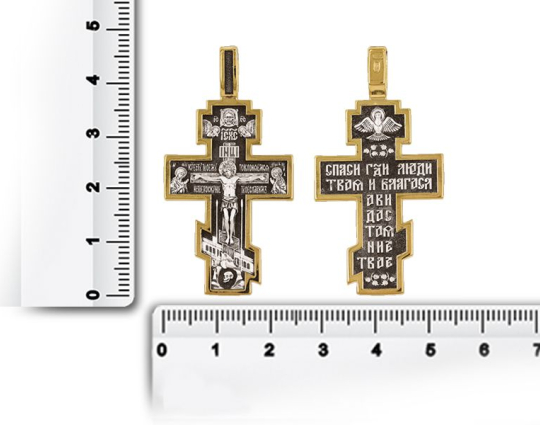 Массивный крест из серебра с позолоченной отделкой. На лицевой части в центре изображено Распятие Христово. По бокам от него - склонившиеся в молитве фигуры: Богоматерь и Иоанн Предтечей.