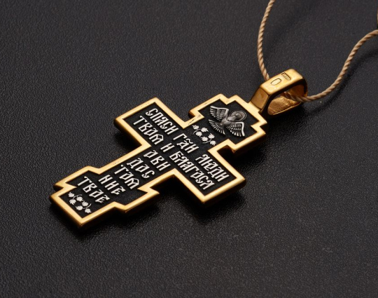 На обратной стороне креста размещены Божественные слова: два стиха из тропаря Кресту.