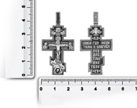 Серебряный крест лаконичной геометрической формы. На лицевой части в центре изображено Распятие Христово, вокруг которого священные слова. По бокам от него - склонившиеся в молитве фигуры: Богоматерь и Иоанн Предтечей.