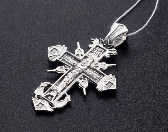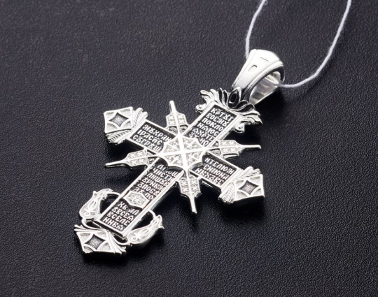 Необычный серебряный крест с  декоративными элементами и украшениями в местах пересечения планок и на их концах.