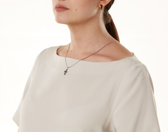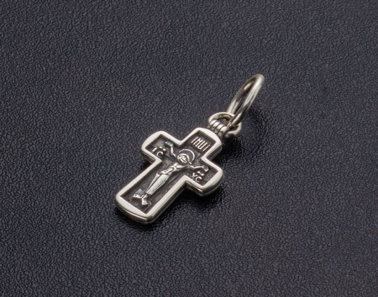 Серебряный крест с изображением Распятия Иисуса Христа, которое выполнено в примитивистской манере. Часто такие изображения встречались в древние времена, когда вера только получала свое распространение.