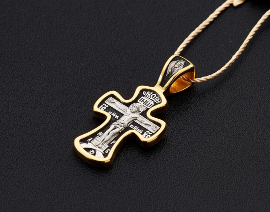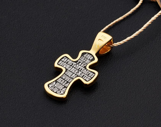 Массивный серебряный крест с изображением Распятия Иисуса на лицевой стороне. Оно нанесено на затемненный фон, чтобы усилить духовную значимость этой библейской сцены.  На нательную сторону нанесена оградительная молитва. С этими словами к Богу обращаются в опасных жизненных ситуациях и для охраны от злых духов.