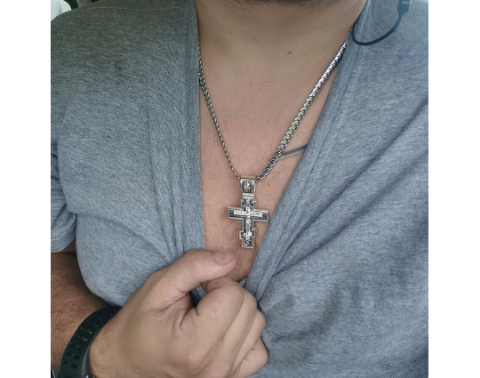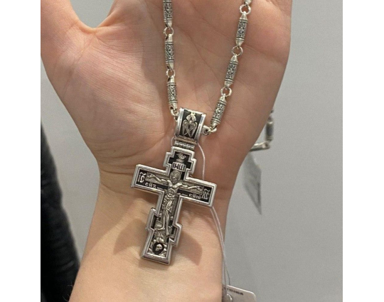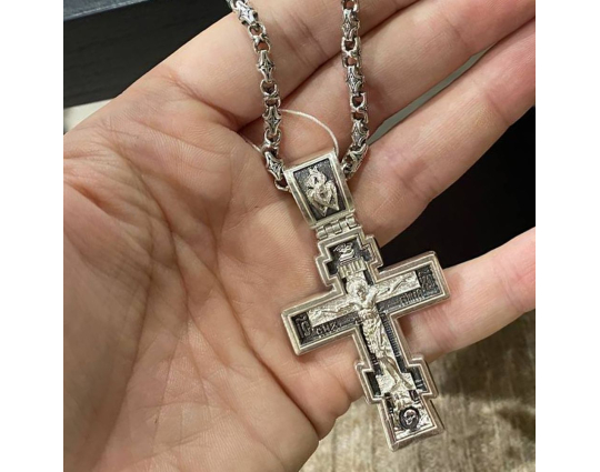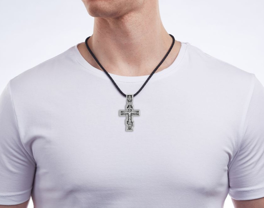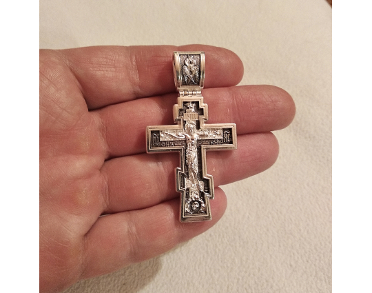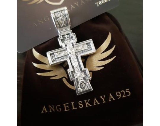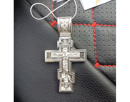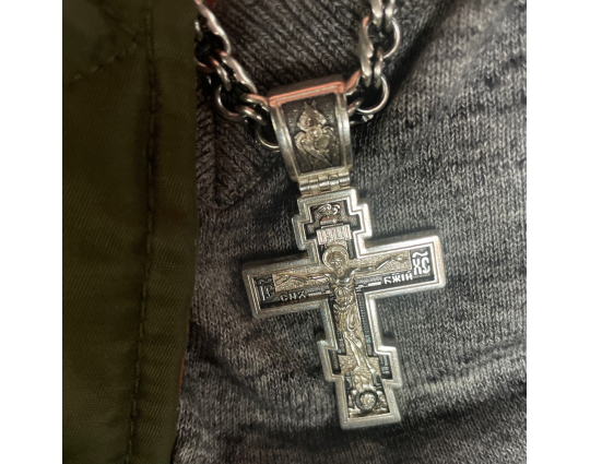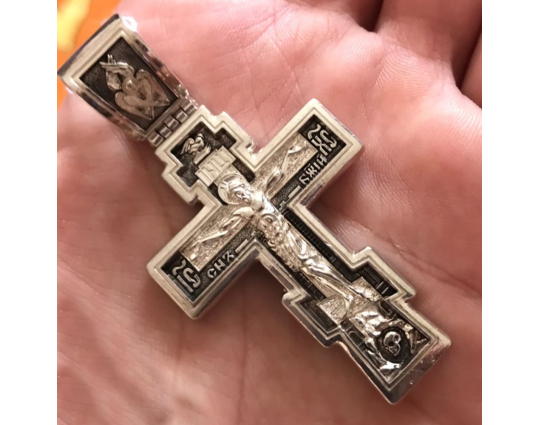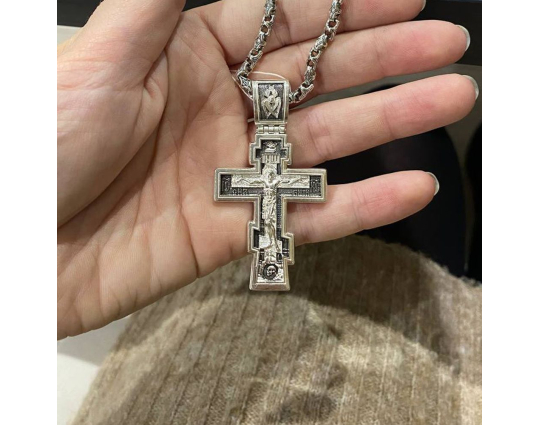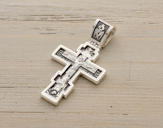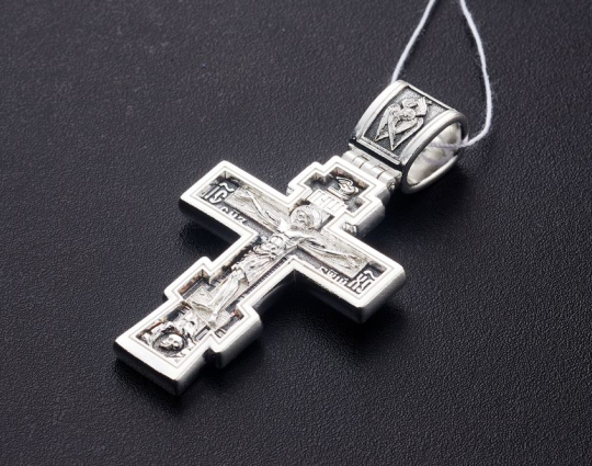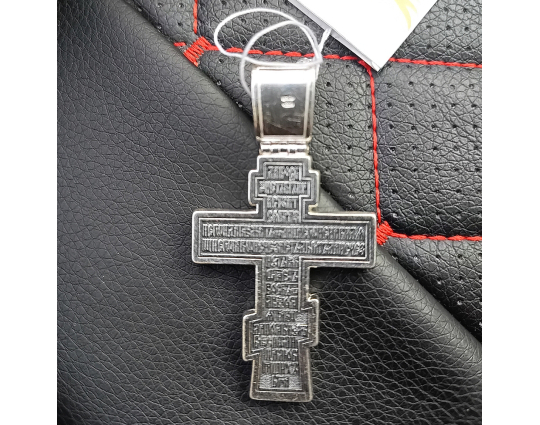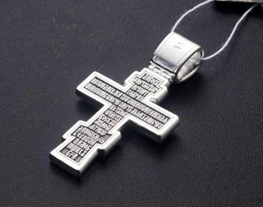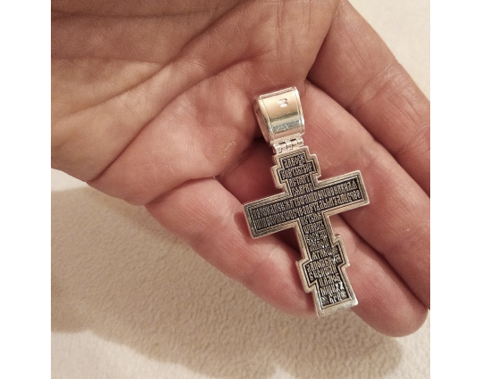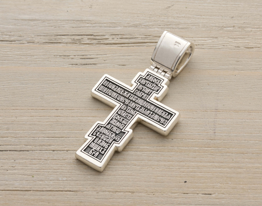 Серебряный крест с изображением Распятия Христова на лицевой стороне и оградительной молитвой на обороте. С этими словами к Богу обращаются в опасных жизненных ситуациях и для защиты от злых духов.
