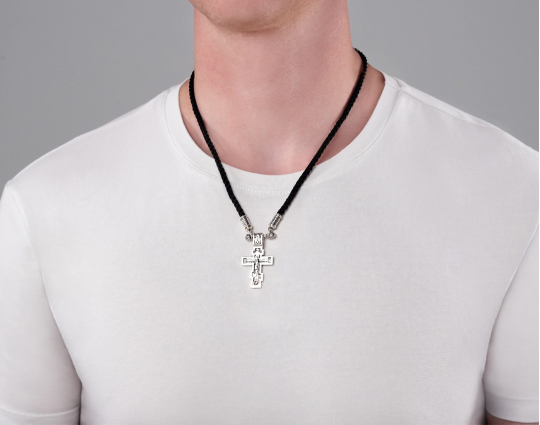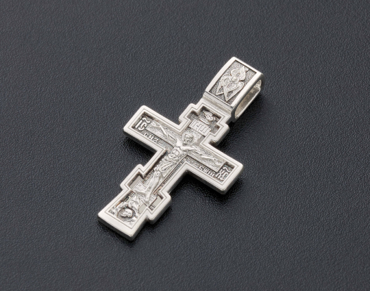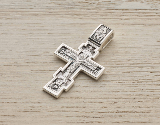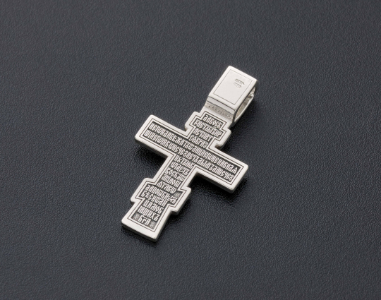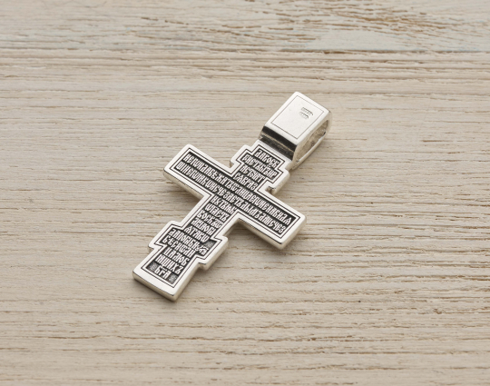 Православный нательный серебряный крест с изображением Распятия Христова на лицевой стороне и оградительной молитвой на обороте. С этими словами к Богу обращаются в опасных жизненных ситуациях и для защиты от злых духов.