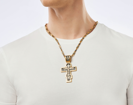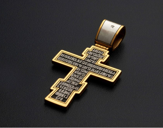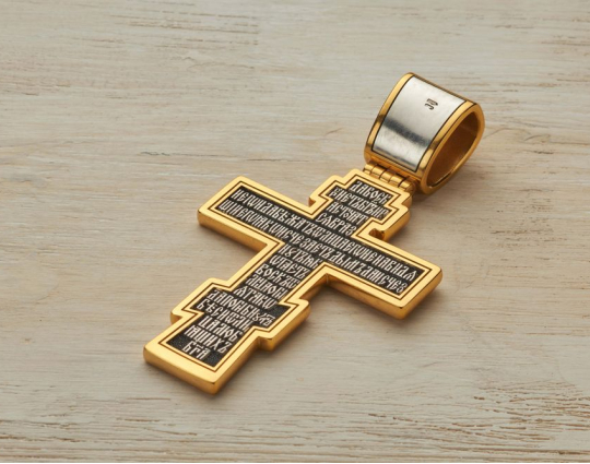 Православный нательный серебряный крест с изображением Распятия Христова на лицевой стороне и оградительной молитвой на обороте. С этими словами к Богу обращаются в опасных жизненных ситуациях и для защиты от злых духов. По контуру - позолоченная отделка.