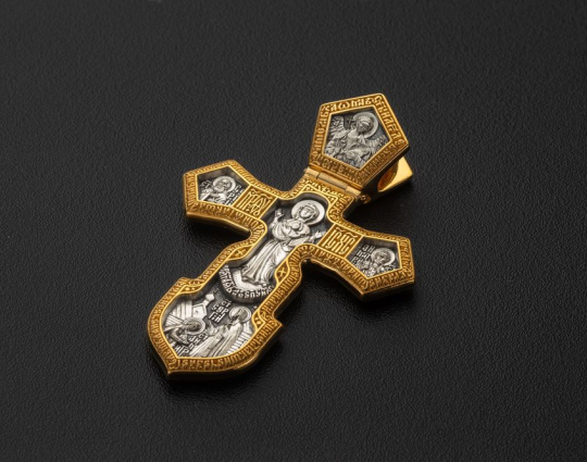 Оборотная сторона креста содержит изображение Богородицы, представленной в древней иконографии «Оранта». В полный рост, с воздетыми в молении за всех людей руками. На Ее груди — Иисус Христос в образе Младенца, у ног — молитва «Пресвятая Богородица, спаси мя».