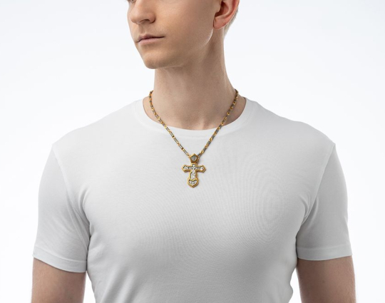 Крупный мужской крест выполнен в традиционной форме якоря: это отсылка к словам апостола Павла о том, что надежда «для души есть как бы якорь безопасный и крепкий» (Евр. 6: 18–19).