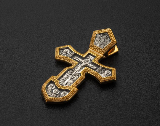 На лицевой стороне изображено Распятие Христово с предстоящими Богоматерью и Иоанном Богословом. По бокам помещены святители Николай Чудотворец и Спиридон Тримифунтский - чудотворцы и скорые помощники во всяких жизненных делах, путешествиях, честном предпринимательстве.