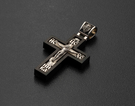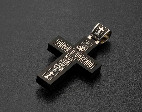 Православный крест с серебряным распятием и молитвой - обращением к Христу. Спаси и Сохрани | ke039 | Серебро 925 пробы, эбен