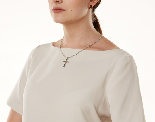 Серебряный крест с изображением Распятия Иисуса на лицевой стороне. Оно помещено в крестообразную рамку, за которой, на концах креста написаны священные слова.