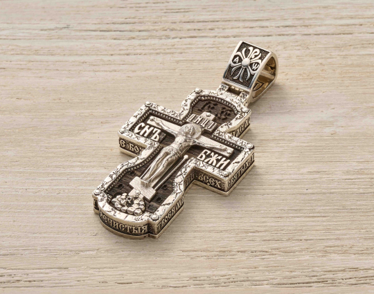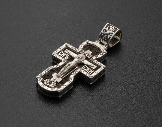 Серебряный крест выполнен на основе эбена. Сочетание дерева и серебра имеет символическое значение, особую значимость. Деревянная часть воспринимается как напоминание о Животворящем Кресте. Это как источник боли и страданий для Христа, так и спасение для любого верующего.