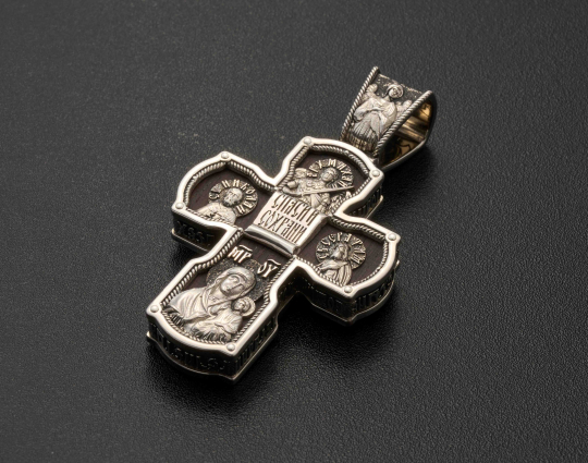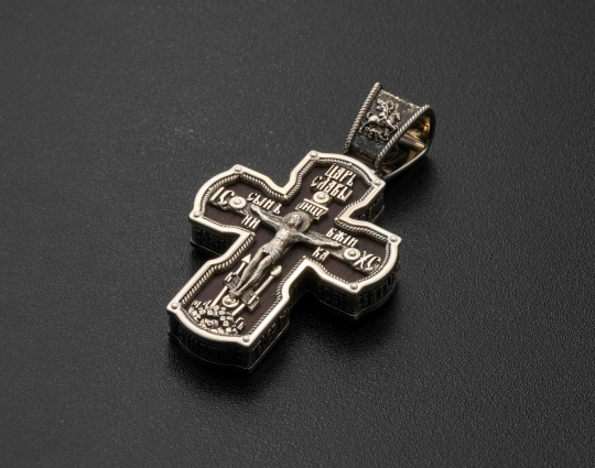 Серебряный крест выполнен на основе эбена. Сочетание дерева и серебра имеет символическое значение, особую значимость. Деревянная часть воспринимается как напоминание о Животворящем Кресте. Это как источник боли и страданий для Христа, так и спасение для любого верующего.