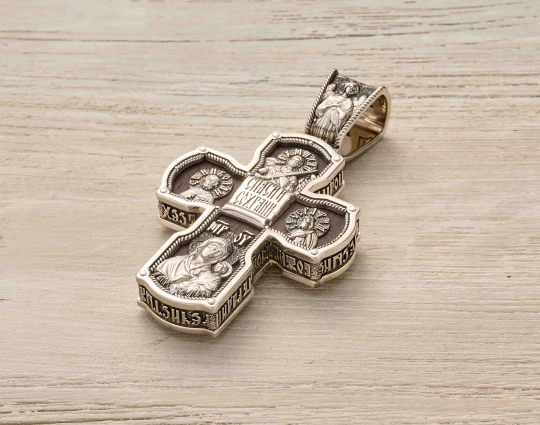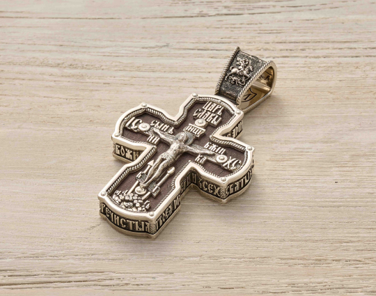 На лицевой стороне находится Распятие с традиционными православными символами и элементами. Над ним находится надпись "Царь Славы", а на ушке - изображение Георгия Победоносца, побеждающего змея.