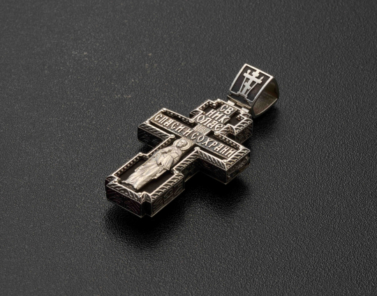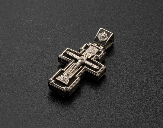 Серебряный крест выполнен на основе эбена. Сочетание дерева и серебра имеет символическое значение, особую значимость. Деревянная часть воспринимается как напоминание о Животворящем Кресте. Это как источник боли и страданий для Христа, так и спасение для любого верующего.