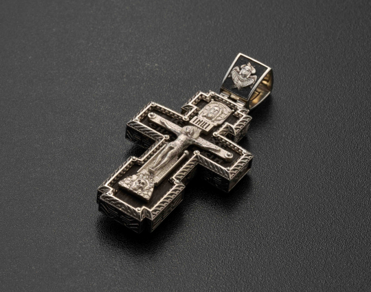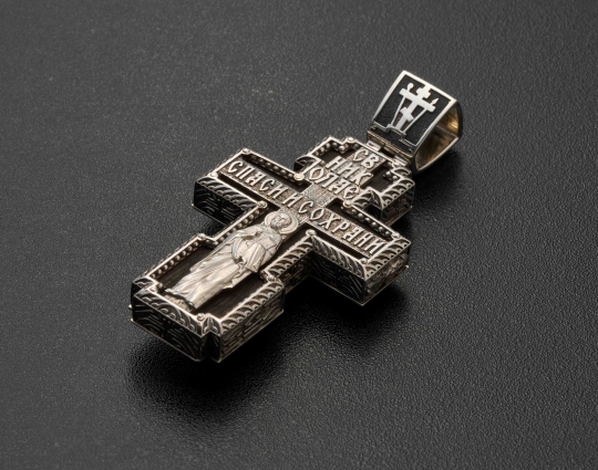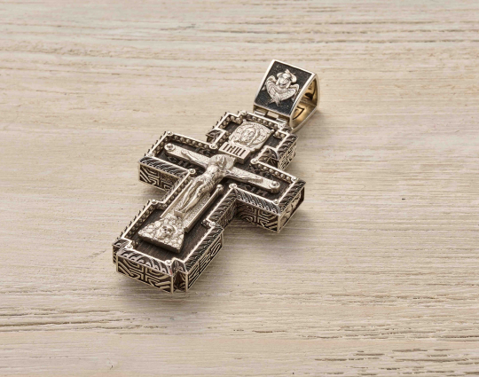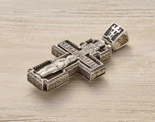 Серебряный крест выполнен на основе эбена. Сочетание дерева и серебра имеет символическое значение, особую значимость. Деревянная часть воспринимается как напоминание о Животворящем Кресте. Это как источник боли и страданий для Христа, так и спасение для любого верующего.