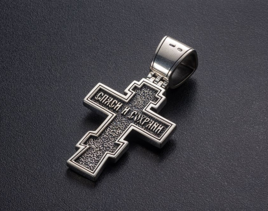 Серебряный крест строгой геометрической формы. На лицевой стороне креста изображено Распятие Иисуса. На обороте в центре написана короткая молитва, слова-обращения к Богу: СПАСИ И СОХРАНИ. Этой молитвой пользуются как в обычных, бытовых ситуациях,  так и в случаях крайней опасности, угрозы жизни или душевному спокойствию.