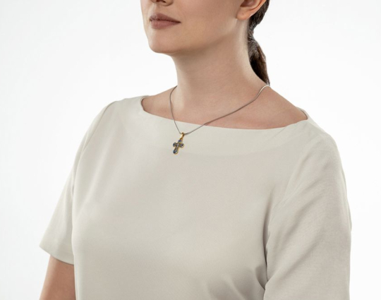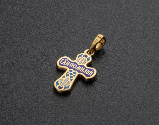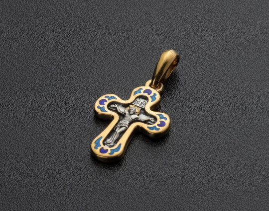 Крестик выполнен из серебра 925 пробы с позолотой с использованием горячей эмали. Он соответствует всем православным канонам. На обратной стороне размещены слова молитвы "Господи, Помилуй". Цвета эмали подобраны теплые, в основном - голубой и синий, как символ Небесного Царства. В верхней и нижней частях креста - цветки лилии, символ Богородицы, чистоты и благочестия.