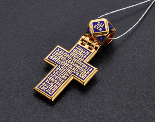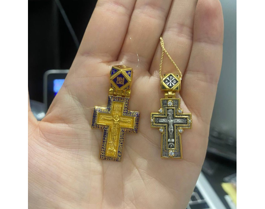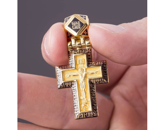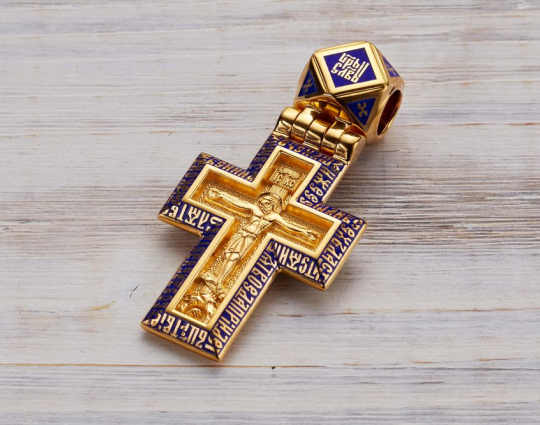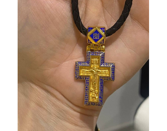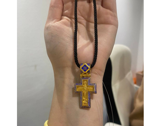 Массивный серебряный крест, выполненный в византийском стиле и украшенный золотом и цветной эмалью. На лицевой стороне изображено Распятие Христа на фоне прекрасного города Иерусалима. Распятие Христово является символом христианства и олицетворяет победу над злом и смертью. Молитва в виде буквенного орнамента, нанесенная в позолоченных рамках, окружает Распятие. На ухе креста расположены надписи «Царь Славы» и «Сын Божий».