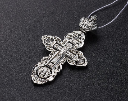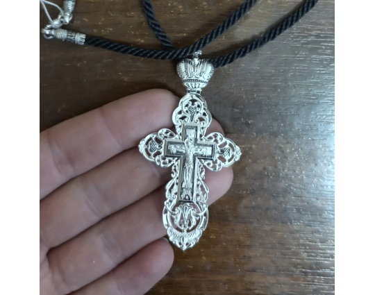 Серебряный крест, на лицевой части которого в центре изображено Распятие Христово. Оно окружено изящным резным орнаментом.