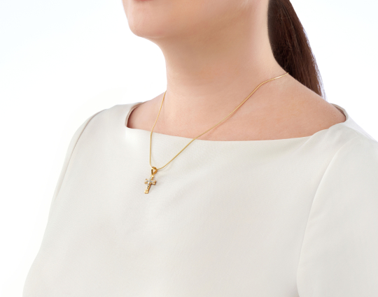 Православный крест из серебра с позолотой. Распятие изображено на фоне, покрытом позолотой. Это подчеркивает его духовную значимость.