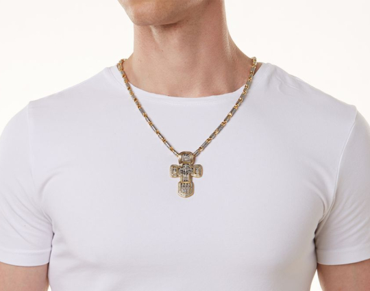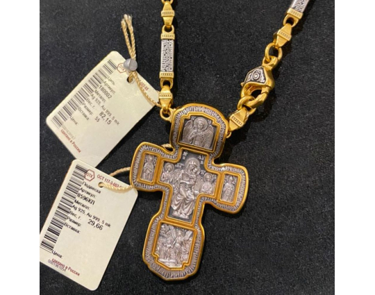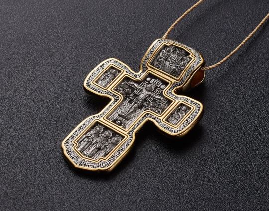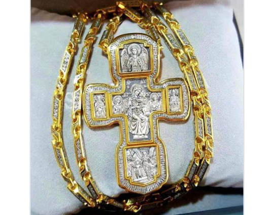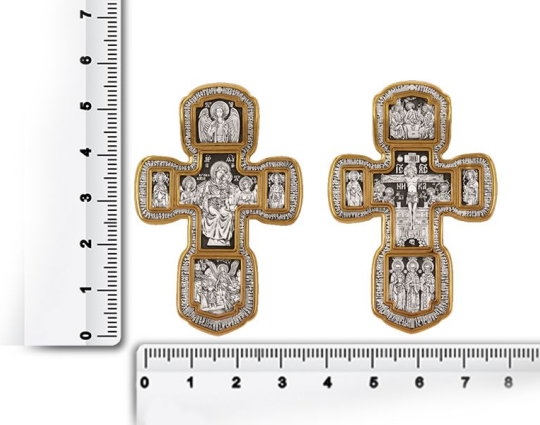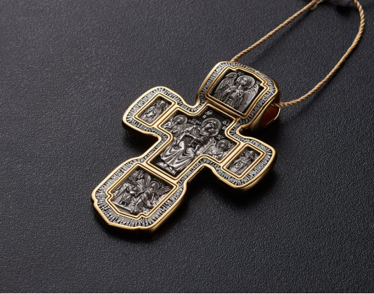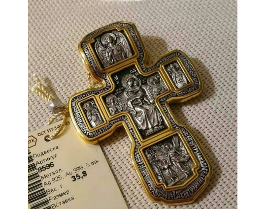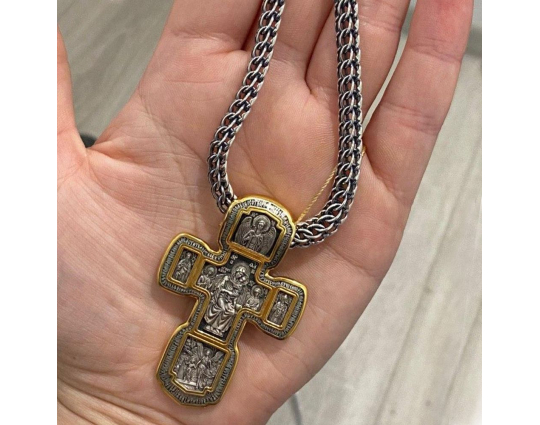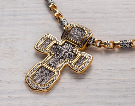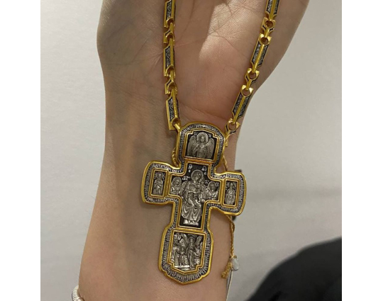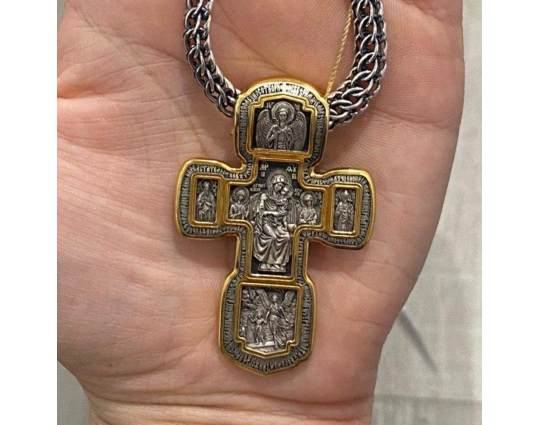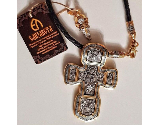Серебряный крест с изображением в центральной части Распятия Христова и тех Святых, которые были рядом с Ним в тот момент. Возле Распятого Иисуса-самые значимые для верующих иконы: Святая Троица, Три Спасителя Вселенских. По бокам, на горизонтальной планке - иконы Святого Николая и Мученика Трифона. По контуру ювелирное изделие огибают слова-обращения к Богу и тонкий позолоченный кант.