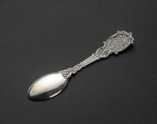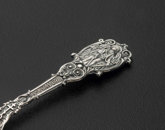 На ложечке написаны две молитвы Ангелу Хранителю. Спереди на черенке: «Ангеле Христов, сохрани мя». На обороте молитва Ангелу против напастей и печалей: «Всяких мя напaстей свободи, и от печaлей спаси, молю ти, Святый Ангеле, дaнный ми от Бога, Хранителю мой добрый».