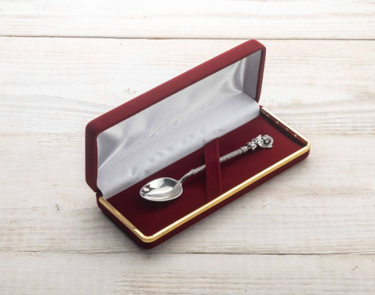 На черенке находятся слова молитвы Ангелу Хранителю, оберегающие от горестей и напастей: «Всяких мя напaстей свободи, и от печaлей спаси, молю ти, Святый Ангеле, дaнный ми от Бога, Хранителю мой добрый». Ложка упакована в красивый подарочный футляр.