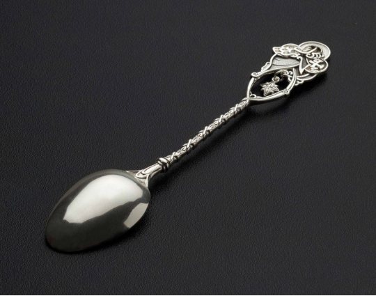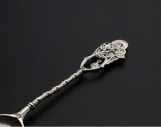 Изящная серебряная ложка с фигуркой Ангела, который обнимает Хризму - символ Христа. По фигуркой Ангела находится подвеска в виде Вифлеемской звезды. Она символизирует стремление обрести веру и надежду, стремиться к единению с Богом.