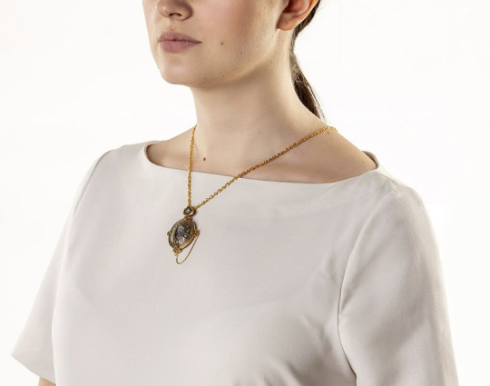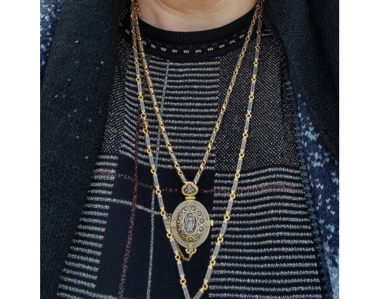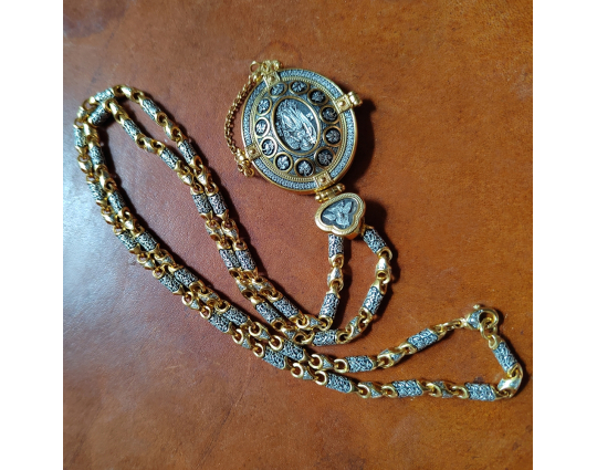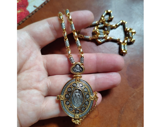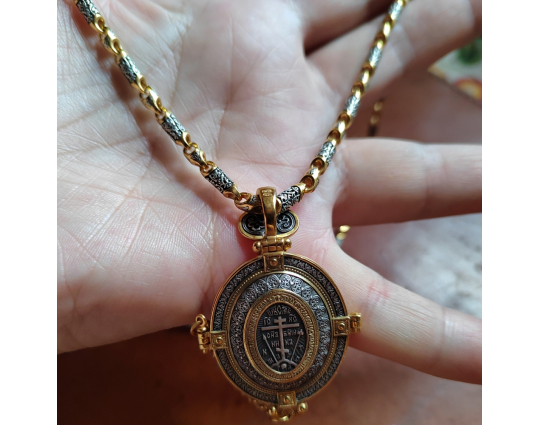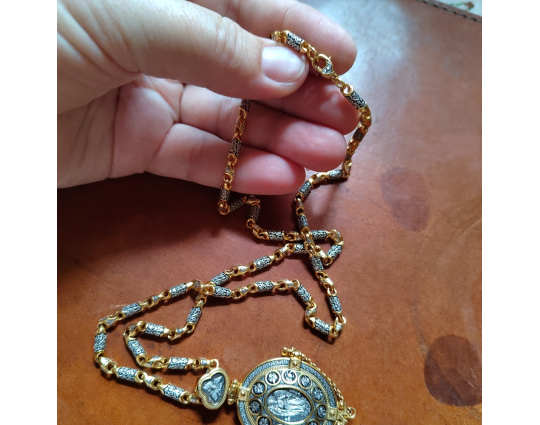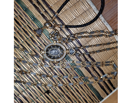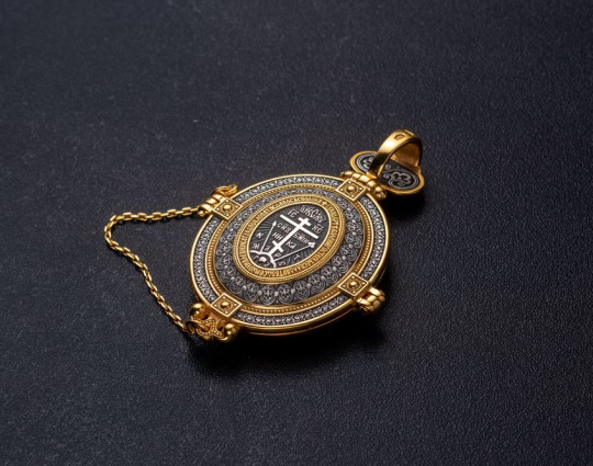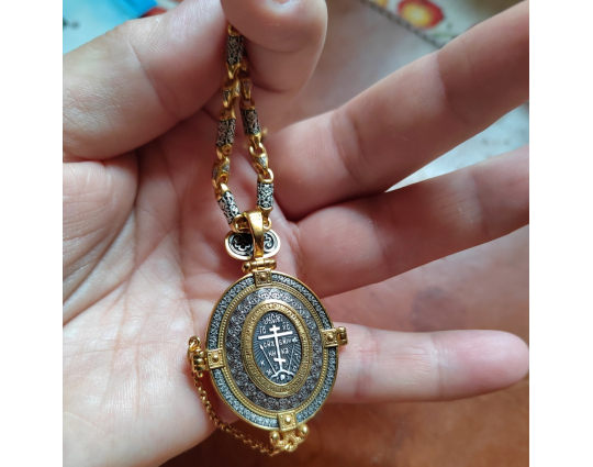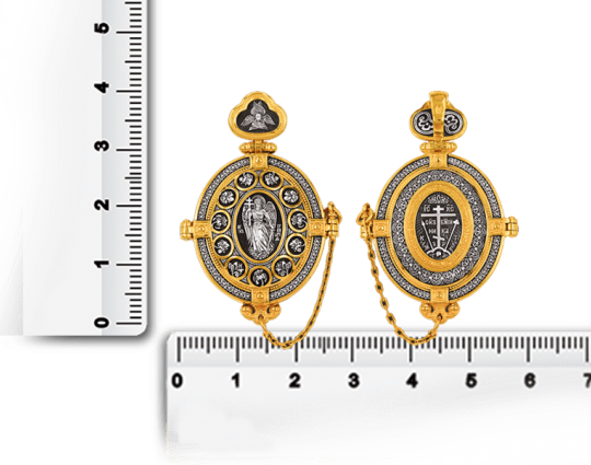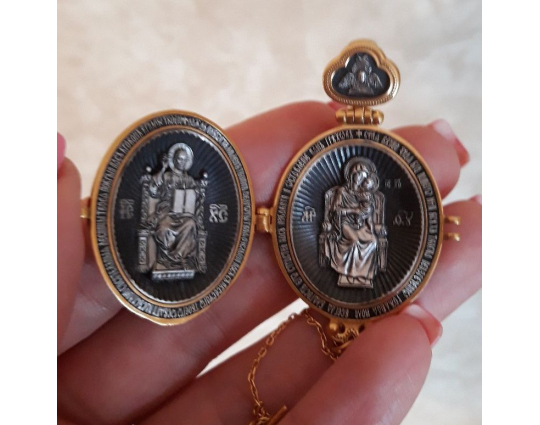 Внутри мощевика- две иконы. Это образы Христа и Богородицы, воплощенные в иконах Спаса Вседержителя и Богоматери Толгской. К ним обращаются за благословением, за помощью в сложных ситуациях. Вокруг икон написаны молитвы, которые Вы можете использовать при свое разговоре с Всевышним.