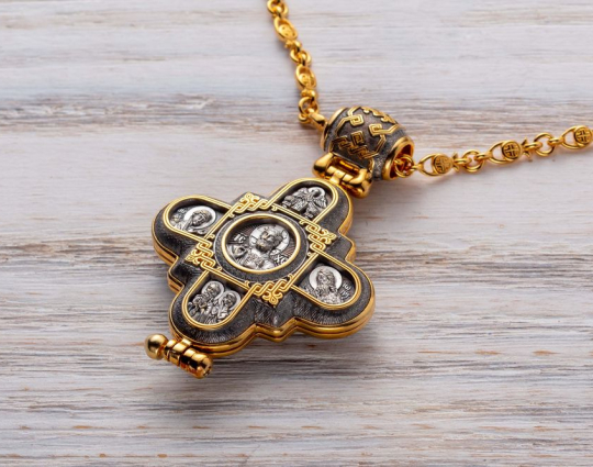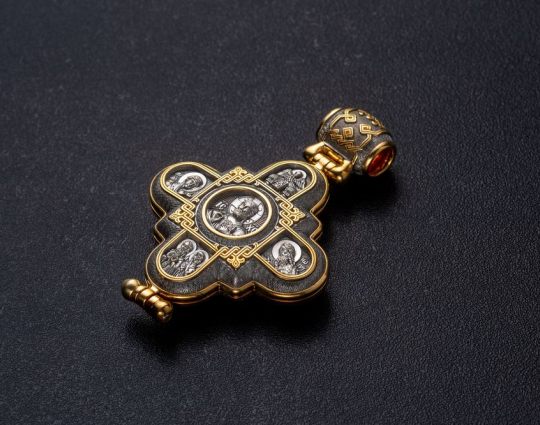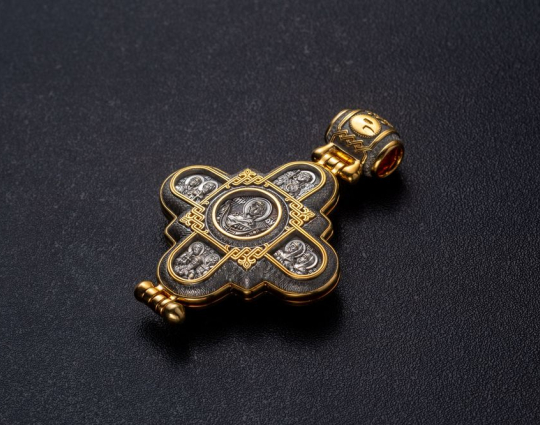 Изящный мощевик из серебра с позолоченной отделкой. Его украшают изображения ликов Святых. Они выбраны таким образом, что этот мощевик можно назвать «Семейным».