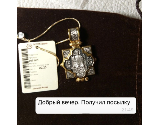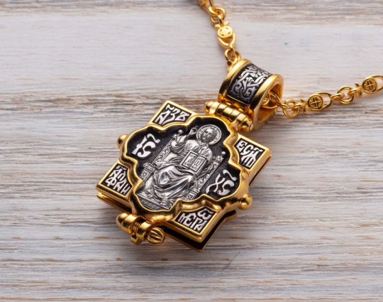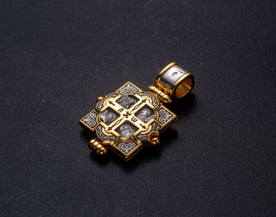 Мощевик из серебра с изящной позолоченной отделкой. На лицевой стороне изделия - изображение Иисуса в образе Господа Вседержителя с Книгой Судеб в руках. Вокруг него написаны священные слова. На обороте мощевика начертаны символы евангелистов, которые хорошо знакомы каждому, кто с почтением относится к вере. Это: орел, лев, телец, ангел.