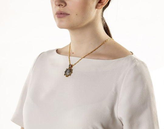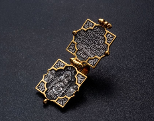 Внутри этого ювелирного изделия помещена икона, перед которой склоняются все, кто желает исцеления от онкологических заболеваний для себя и своих близких. Это - икона Богоматери «Всецарица». Вокруг нее расположились ее верные помощники- Ангелы. В верхней части внутренней створки мощевика - слова из молитвы, с которой можно обращаться к Богоматери.