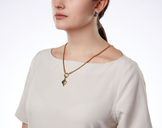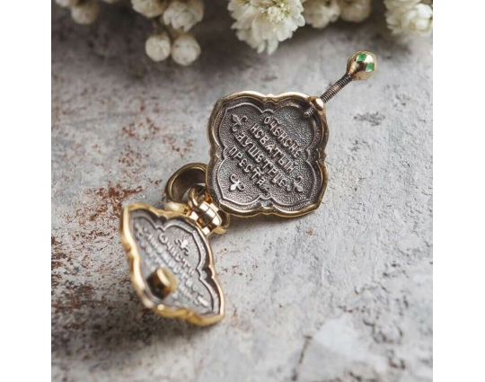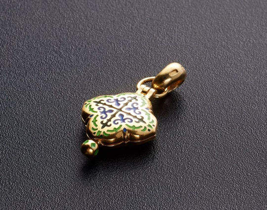Позолоченный мощевик крестообразной формы с изящной эмалевой росписью в виде лилий. Эти цветы- символ чистоты и невинности души, которая обращается к Богу со своими молитвами.