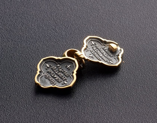 Внутри мощевика начертана молитва «Слава из молебного пения за воинов»: «Отче, Слове и Душе, Троице святая, очисти множества согрешений наших».
