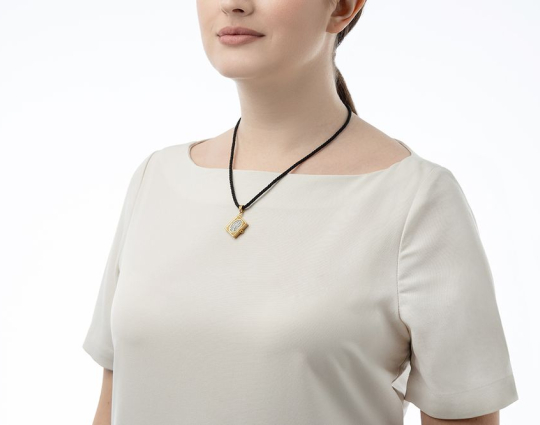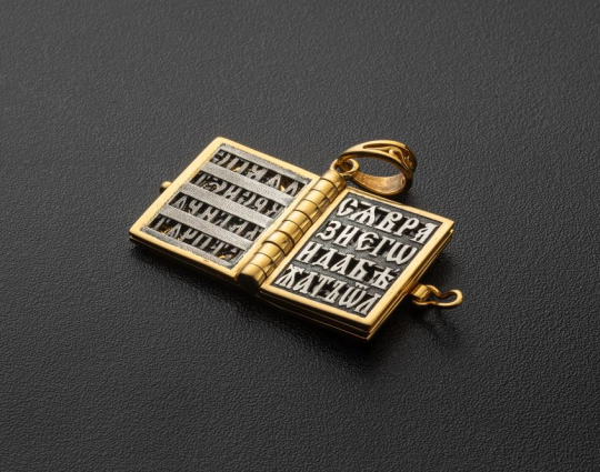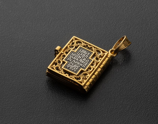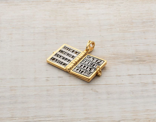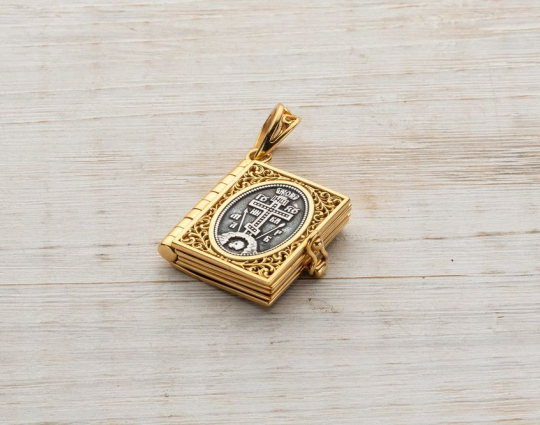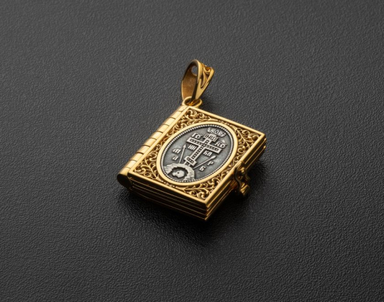 Подвеска изготовлена из серебра 925 пробы с позолотой. Она выполнена в виде книги, на которой начертаны слова молитвы. Такой молитвенник можно взять с собой в дорогу или носить повседневно. Что бы важный текст был всегда под рукой и к нему можно было обратиться в любой момент.